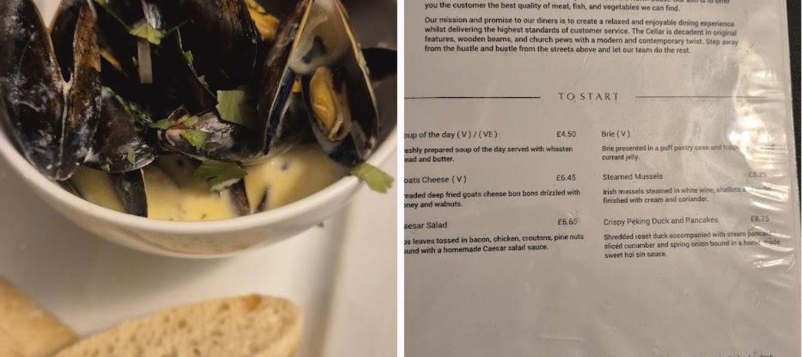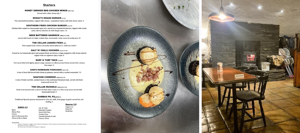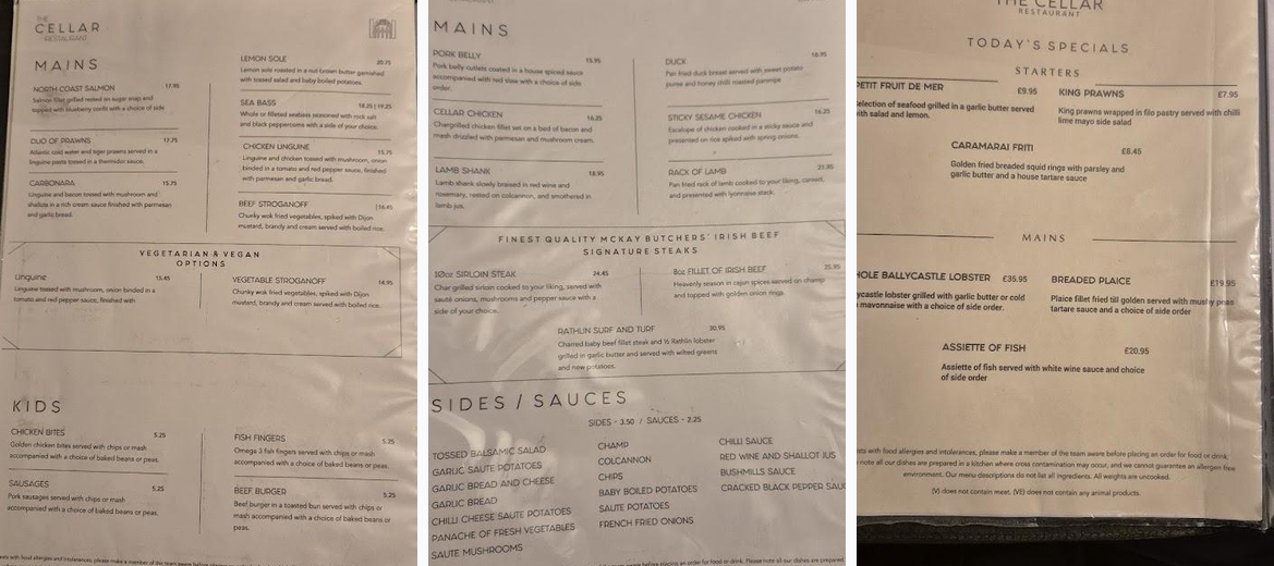 The Cellar Restaurant offers a diverse menu with 32 dishes. Must-tries include local seafood like Hole Ballycastle Lobster and Carrick-A-Rede Salmon, as well as hearty options like 6oz Rump Steak and Sausage and Mash.